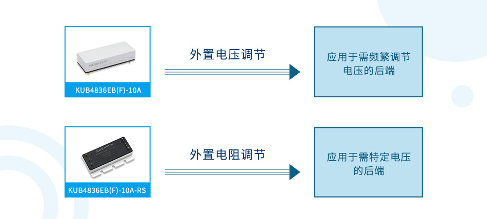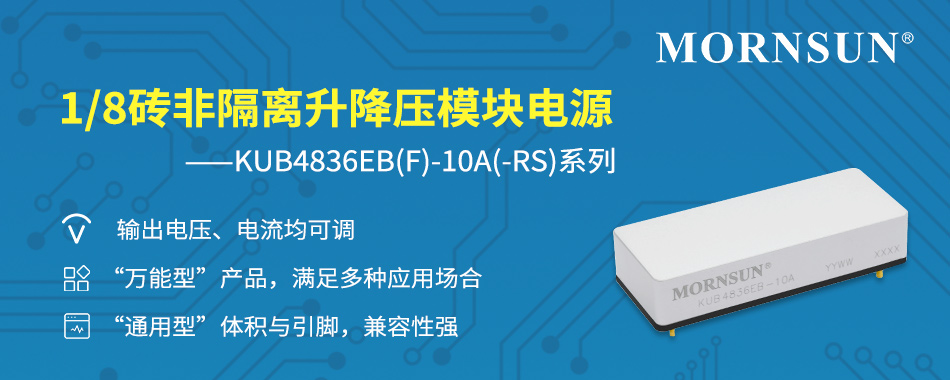 KUB4836EB(F)-10A(-RS)系列是MORNSUN为满足客户对输出电压、电流均可调的应用需求,推出的1/8砖非隔离升降压模块电源产品。