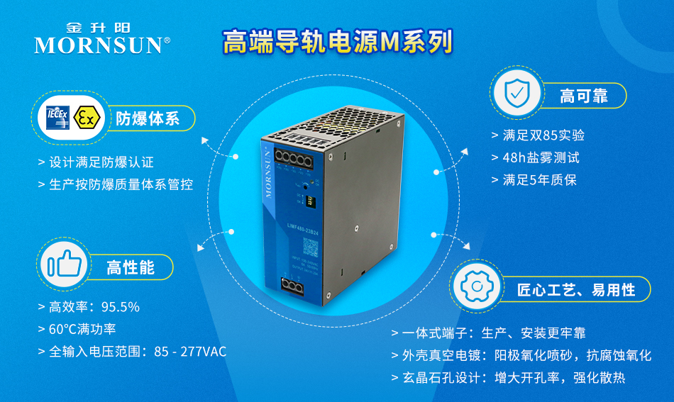 金升阳高端导轨电源M系列——LIMF240/480-23Bxx满足防爆认证,60℃可满载工作,提供5年质保,且兼具防盐雾、5G抗震、三防漆保护等优势,为用户提供更稳定、更安全的电源。