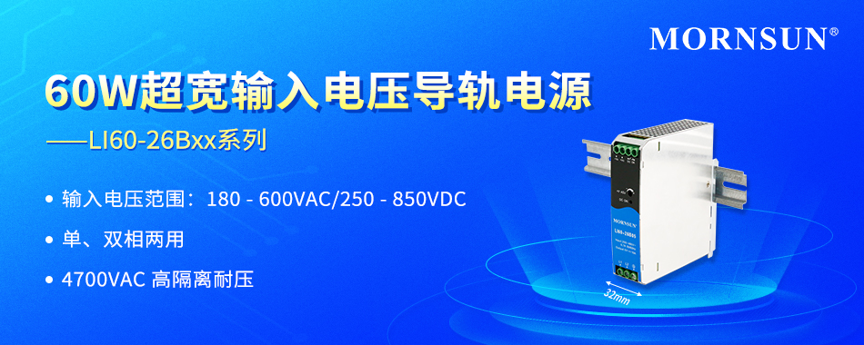 金升阳持续完善导轨电源产线布局,推出60W的超宽压导轨电源——LI60-26Bxx系列,该系列满足单相或两相的180-600VAC宽范围输入,安全可靠、性价比高。