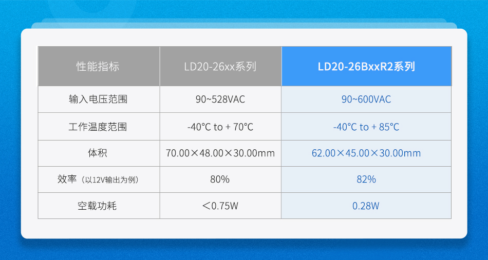 金升阳的LD20-26BxxR2系列AC/DC电源,是在LD20-26Bxx基础上升级优化的产品。继承了高性价比、宽工作温度范围等优势的同时,精益求精,扩大了输入电压范围,同时压缩了产品体积。使产品的应用场景得到了拓宽,并显著降低了因过压问题而失效的风险,进一步拉开了与市面上同类产品的差距。为广大工程师提供了安全、可靠、高效的解决方案,消除了系统供电方案的后顾之忧。