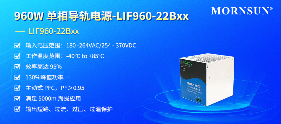 金升阳金属导轨LIF系列在功率段120-480W的基础上进一步拓展,开发出960W单相导轨电源LIF960系列,满足不同领域对高功率导轨电源的需求。