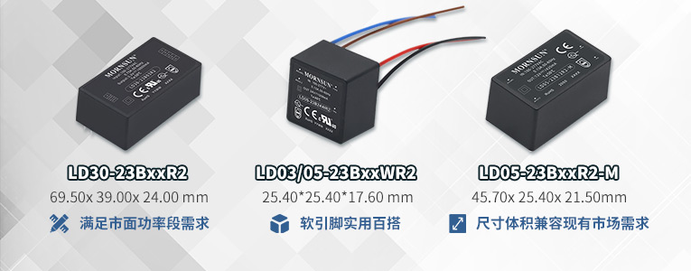 LD30-23BxxR2:体积仅69.5x 39x 24mm,相比旧系列约节省30%体积;LD03/05-23BxxWR2:3/5W尺寸业界最小1”*1”,采用软引脚,实用百搭,处于行业领先水平,不断提升客户对空间利用率的需求满意度;