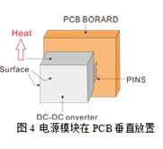 PCB板提供了一种散热途径,在设计时就要多考虑散热途径。例如加大主回路的铜皮面积,降低PCB板上元器件的密度等,改善模块的散热面积和散热通道,例如电源模块应尽量垂直放置如图4,可以使热量尽快向上散发;如果将DC-DC模块放在PCB的底部,则向上散发的热量会被PCB阻挡,导致产品积热无法散发出去。