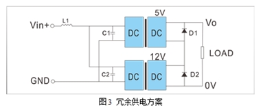在可靠性要求高的场合,要求电源模块即使损坏,系统也不能断电。此时,我们可以采取冗余供电的方式来提升系统的可靠性。如下图所示,当一个电源模块损坏时,另外一个模块可以继续供电。图3为其中一种常见的冗余设计方案。