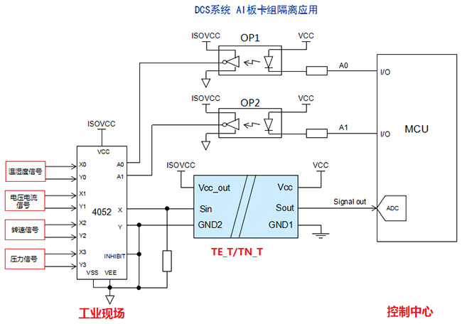 应用解决方案如图1所示,是在多通道信号采集中较为经济且可靠的一种信号隔离的方法。控制系统中的MCU通过多路选择开关4052对现场各传感器采集的电信号进行选择选通,然后通过信号隔离模块进行电压/电流信号的隔离传输,然后再由ADC进行采样,转换为数字信号。多路选择开关4052的选通信号通过光耦OP1、OP2来实现,4052以及光耦驱动均通过信号隔离模块进行供电,无需再单独设计隔离电源。