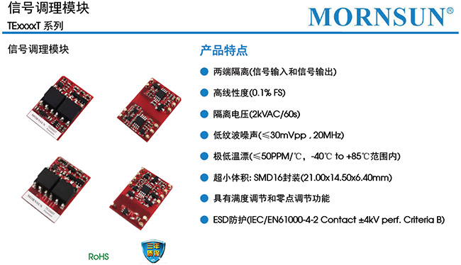 其中信号隔离模块采用的是TE_T/TN_T,它是金升阳科技所开发的电压信号调理模块系列,具有高集成度、高精度、高可靠性、小体积以及表贴封装等特点。因为集成了信号处理、信号隔离以及电源隔离功能,可以使用户在进行电路设计时更为方便,减少了设计、调试的问题。信号输入以及输出满足2000VAC的电气隔离电压,可以轻松应对大部分的工控应用领域,pF级的隔离电容可以有效阻断干扰信号的能力传递。此外具有极低的线性误差0.04%typ以及极低纹波噪声20mVtyp,其21*14.5*6.4mm的小体积表贴式封装可以满足客户的SMT工艺。广泛应用于高精度信号隔离处理的应用领域、尤其是煤矿、电力、风电等领域。