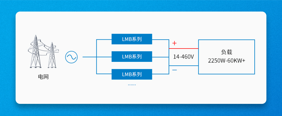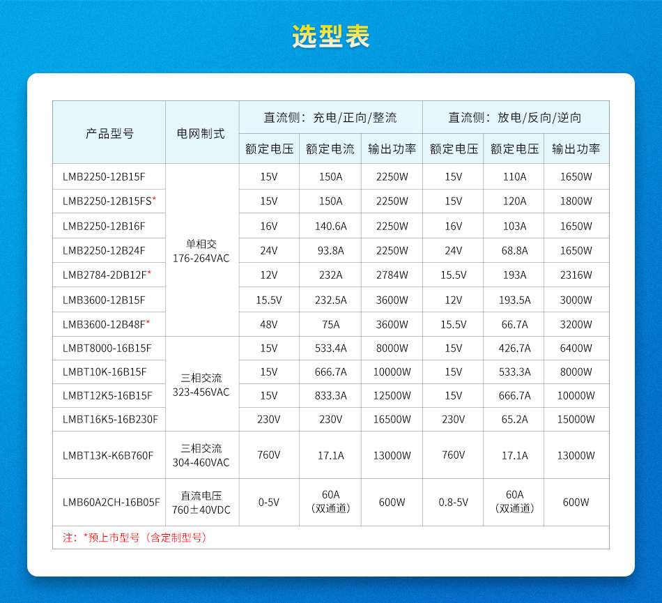 目前已上市低压(15-24V)输出2250W、3600W、8KW、10KW、12.5KW和中压(230V)输出16.5KW,该系列电源采用双向能量回馈技术,可实现90%以上电能循环利用,具有高效率、强大的电网和环境适应性、双向无缝切换、安全隔离等优点。且配备了优秀的服务与技术支持团队,为客户提供省钱省力高品质无忧电源。