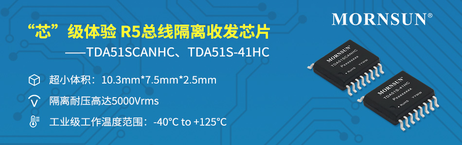 R5总线IC是一款集成电源和数字隔离的芯片化产品,通过精密设计,在芯片内部实现了电源隔离+信号隔离方案。以TDA51SCANHC、TDA51S-41HC为例:客户在应用过程中,只需要提供5V的电压,即可轻松实现1M频率下,多达110个节点的纳秒级CAN总线信号传输。