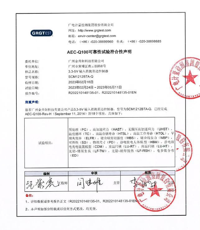 2) 已通过第三方AEC-100车规级认证(报告编号R202210148135-01);