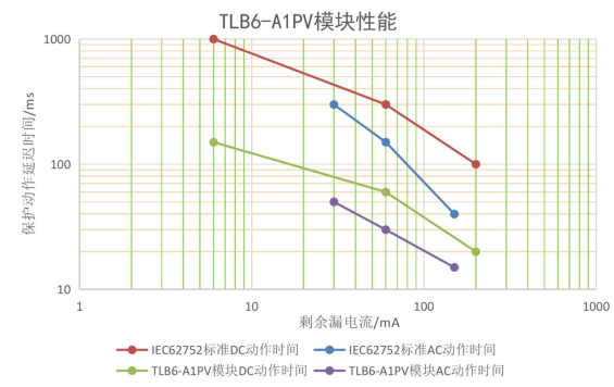 TLB6-A1系列产品动作时间远低于IEC62752标准规定,更快响应,系统剩余电流检测及保护更安全。以下为TLB6-A1PV的实测数据,其动作时间优于标准规定的40%~60%。