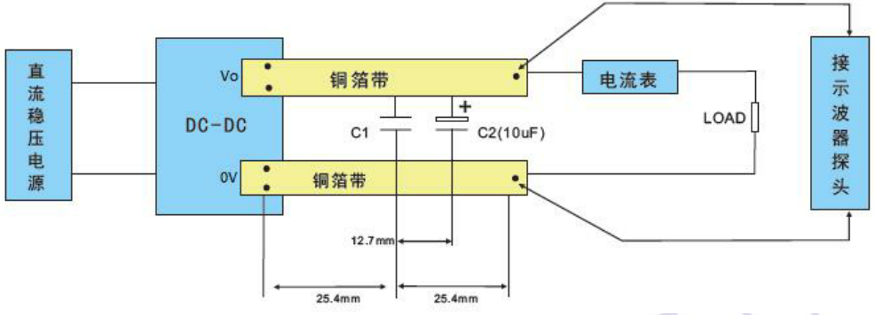 电源模块采用标准的开尔文测试法,如图1所示,测试条件:室温Ta=25℃,湿度<75%。