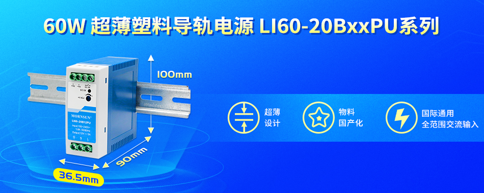 为满足紧凑机箱对电源更轻薄的要求,金升阳推出了超薄塑料导轨LI60-20BxxPU系列,输出电压涵盖05/12/24/48V。该系列具备恒电流限制,国际通用全范围交流输入,4000VAC高隔离耐压等优点,可提供3年质保,为客户应用提供稳定安全的电源供应。