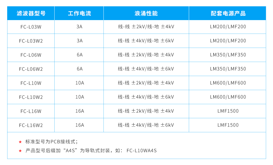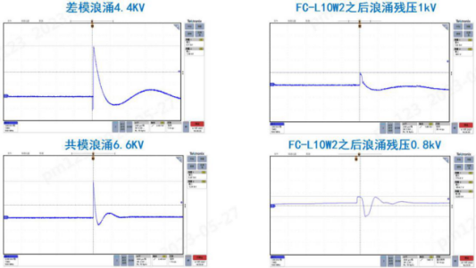 在电源应用前级,由于供电线路波动带来的浪涌对后级设备产生影响,常规线路中的浪涌干扰为差模±2kV/共模±4kV;但在复杂环境下,往往会带来更高的浪涌干扰,FC-LxxWx系列产品浪涌抑制能力可达差模±4kV,对共模±6kV,可有效提升电源方案的浪涌等级。