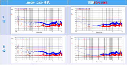 针对电源产品应用前级带来的共差模干扰问题,EMC辅助器FC-LxxWx系列产品基于二阶滤波方案,共差模抑制效果高达60dB,可有效抑制前级的干扰,提升LM系列电源产品传导等级(CLASS A→CLASS B)。