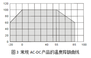 目前,大多数常规电解电容的额定工作温度为105℃,但因电解电容在高温条件下电解液易挥发,电源本身发热较大等原因,常规采用电解电容的AC-DC电源只能工作在70℃的环境条件下。要提高电源的工作环境温度,必须采用价格更昂贵、体积更大的电解电容,或者以降额的方式实现高低温条件下的应用,下面以金升阳常规AC-DC电源产品在高低温环境下的降额要求如图3: