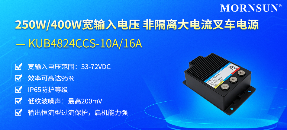 为满足市场对于叉车电源模块的需求,金升阳推出IP65防护级DC/DC非隔离大电流接线式灌封电源产品KUB4824CCS-10A/16A,功率为250W/400W,具有宽电压输入范围,保护功能齐全等优势,是一款高效率,高可靠性的电源。
