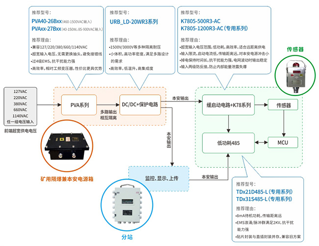 由于是本安输出,隔爆兼本安电源的输出能力比常规的电源已经被限制了很多,所以后端的分站或者传感器用电一方面要保证自己可靠运行,还要考虑和前端本安输出的兼容,做到整个系统的可靠稳定和兼容。