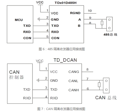 485总线隔离收发器TD501D485H其应用接线图如图7所示;CAN总线隔离收发器TD501DCAN应用接线图如图8所示。该系列产品是针对传统的485总线及CAN总线端口隔离设计方案进行了电源优化,端口静电防护等级优化而推出的集成产品。该系列产品具有以下功能特点: