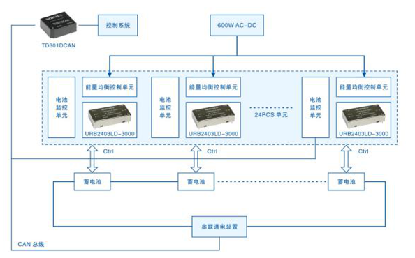 我司URB2404LD-3000恒流输出模块,不仅可以实现输出的稳定恒流,同时可以实现智能远程控制,在充电周期里利用电源自带的Ctrl脚远程关断功能每一秒关闭辅助电源2次,利用关闭间隙精准监测电池电压,直到电池充满电则关闭辅助充电电源,最终实现24节电池全部充满。