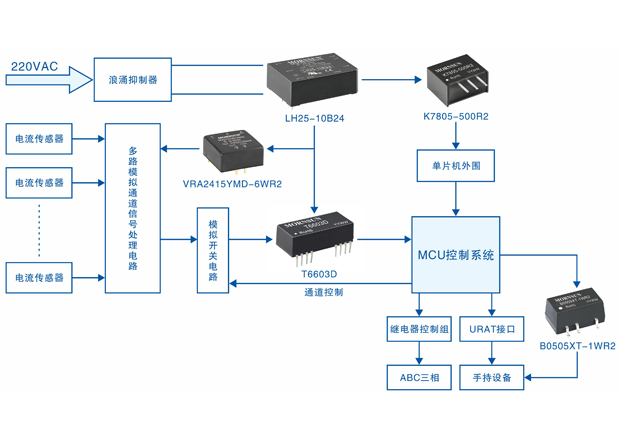 断路器系统电源解决方案:一般给断路器内部处理器、存储器、I/O模块、各种扩展模块供电的电压为5VDC,可通总线提供的24V总线电源利用DCDC模块隔离变压获得。对于通信部分可以通过隔离电源和光耦隔离提高通信的可靠性。信号调理模块的供电由定压稳压系列产品提供稳定的低纹波直流电压。