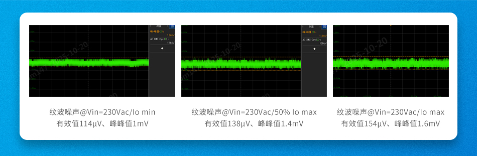 纹波噪声是精密设备的“隐形干扰源”,此产品实现全输入电压范围、全输出负载区间满足极低纹波:有效值200μV(.Typ)、峰-峰值1mV(.Typ),确保设备始终处于“极低干扰”供电环境,数据精度与信号稳定性大幅提升。
