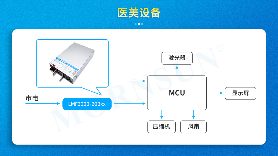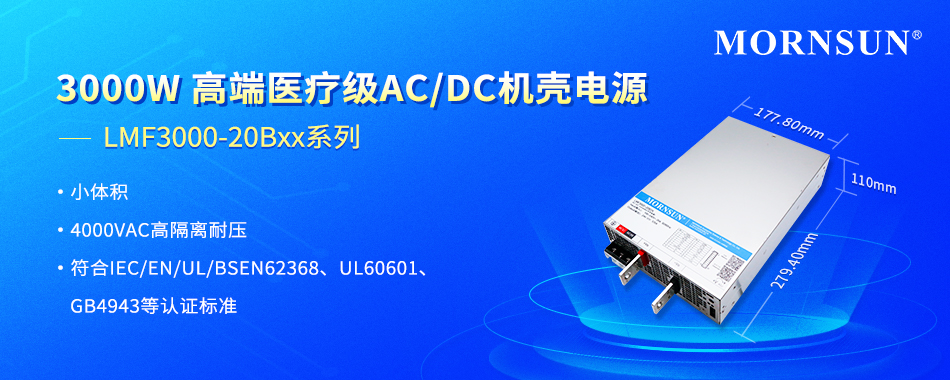 终端设备趋于小型化发展,市面上的大功率机壳开关电源往往比较臃肿。对此,金升阳聚焦大功率电源领域,依托强大的产研实力,打造大功率电源LMF3000-20Bxx系列,功率3000W,兼顾性能与小体积,满足医疗认证,具有高效率(94%)、宽工作温度范围等优势,适用于医疗等领域。
