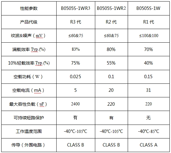 表一 定压R3系列产品B0505S-1WR3的性能对比