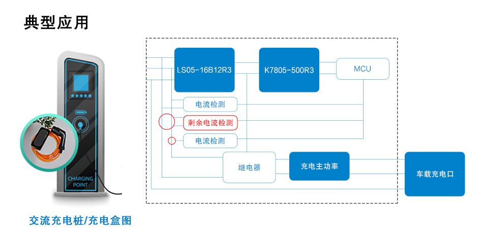 在充电桩将电流进行转换并输送到汽车电池的过程中,电流大小的正常是保证充电过程安全的必要条件。对关键环节上的电流进行准确的测量,及时检测并反馈异常情况。基于此技术,金升阳拓展开发了充电桩专用的B型剩余电流检测模块(集成磁芯、线圈、外围设计,即插即用),敬请期待。