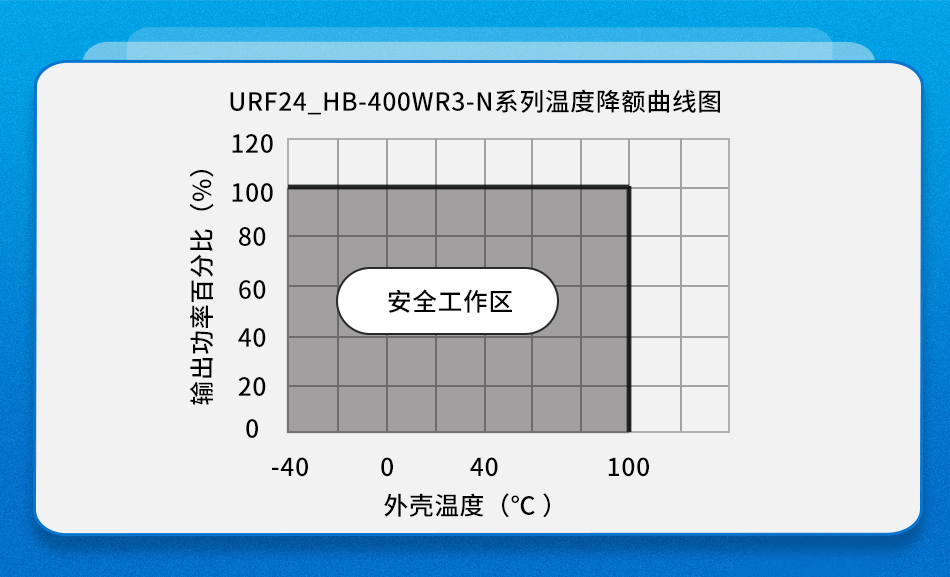 温度性能对于产品稳定性有着不可忽视的影响,URF24_HB-400WR3-N系列产品可实现工作温度范围 -40 to +100℃(壳温),同时,满足标称输入100℃壳温下可带满载的优良性能。