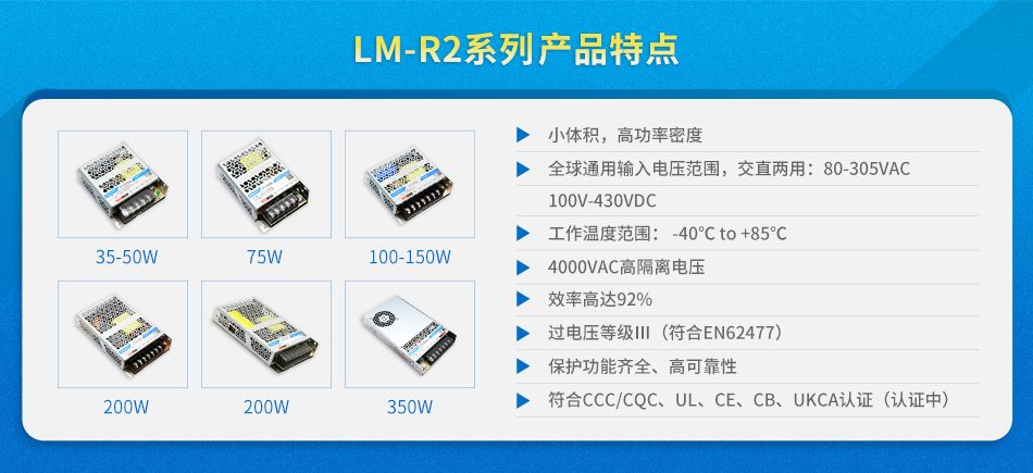 LM-R2系列功率段覆盖35-350W,输出电压包含5-54VDC,在体积、性能、工艺、结构等多方面实现质的飞跃。不得不提的是,LM-R2系列产品的研发产出自主知识产权47项,打破工业电源市场常规,重新定义工业电源标准!