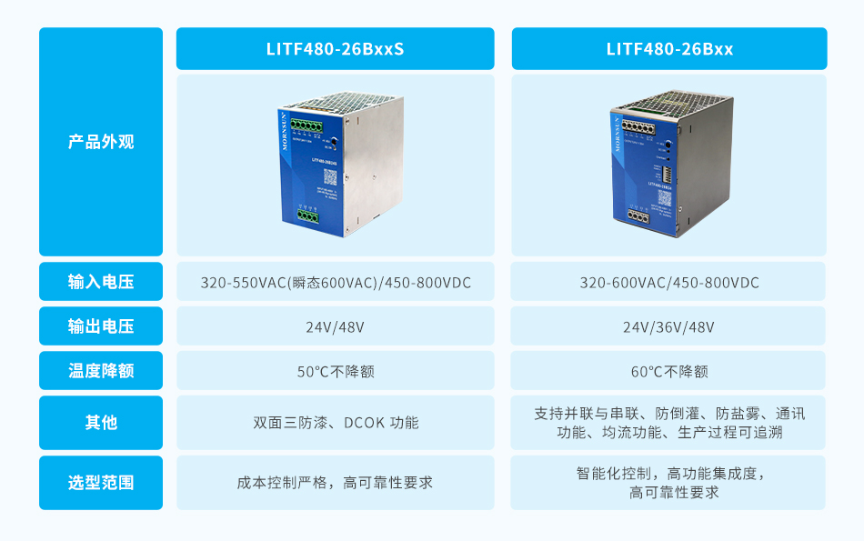 二、 LITF480-26BxxS与高端三相导轨LITF480-26Bxx主要区别