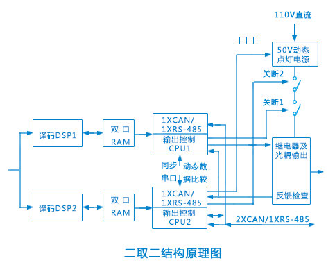 每块主机板内采用二取二容错安全结构,其含义是每块主机板中有2路独立接收译码通道,2路的译码输出进行比较,比较一致才进行有效输出。主机板2路CPU都留有CAN总线或RS-485输出,可与监控设备进行大容量信息传输,同时与并口输出相互校验,实现更高安全性的故障.安全输出,如下图所示。