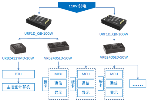 在轨道交通系统中,常规采用110V的直流电压作为主电压,常规的主电源一般都是100W左右的DC/DC 电源,把110V 的电压转换成24V标准的工业用电,再由24V 供电转成5V来给系统的板卡进行供电,由于轨道电路读取器系统的方案为双套电源方案,所以每个系统都需要两套独立的电源模块,而金升阳的DC-DC 铁路电源、以及DC-DC小功率产品在系统中都能提供安全、可靠的解决方案。如下图所示: