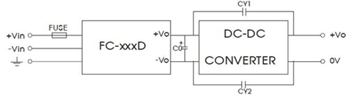 在电路设计方面,由于铁路电源对可靠性以及EMC要求比较高,而我们电源本身是没有EMC防护,所以需要在模块前端设计EMC防护电路,推荐使用FC-CX1D模块达到更高的EMC等级: