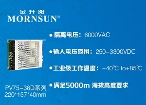此系列具有250 - 3300VDC超宽电压输入,匹配更大SVG功率容量;隔离电压达6000VAC,符合行业标准。体积为220*157*40mm,比市面上已有产品体积约减小65%,同时,PV75-36D系列工业级工作温度范围达 -40℃ to +85℃(高温60℃不降额),满足 5000m 海拔应用要求,且2000米海拔内功率不降额,特别适用于空气稀薄,昼夜温差大的高海拔室外场合。