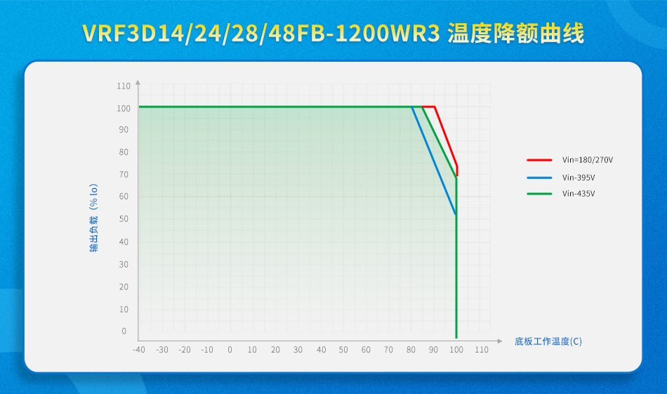 大部分开关电源对于工作温度范围的需求在-40 to +70℃,温度性能对于产品稳定性有着不可忽视的影响,本次VRF3D_FB-1200WR3系列产品实现工作温度范围 -40 to +100℃(壳温),同时,满足270V,90℃下可带满载的优良性能。