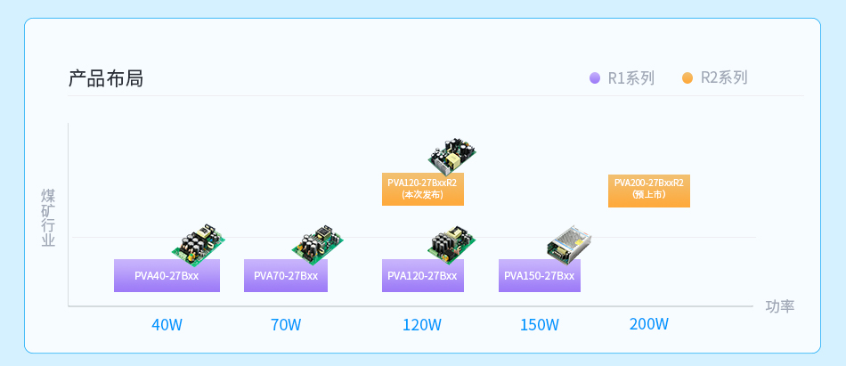 金升阳在煤矿电源领域,已深耕多年,现通过自主技术升级,降体积、降成本、提性能,推出新一代120W煤矿专用高压电源PVA120-27BxxR2系列。该系列输入电压宽(85-900VAC/120-1300VDC),可交流或直流供电,提供3年质保,温度范围宽,使用自主IC,体积比R1减小49%,EMS提高至A等级,冲击电流降至310A,启动更快,集成多重保护,双面涂覆三防漆,性能优异,品质可靠,广泛适用于煤矿监控、安防设备等场合。