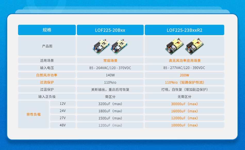 自然风冷下功率的大幅提升的AC/DC开板医疗电源 ——LOF225-23BxxR2系列