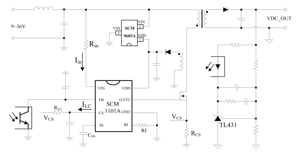 SCM1101A 是一款高度集成的电流模式 PWM 控制器,适用于离线式 DC-DC 变换器。在 SCM1101A 内部,芯片工作频率是经过修调的,具有很高的精度,并且可通过外接不同电阻改变其最大工作频率。在轻载时,芯片的工作频率会随着负载的减小而降低,从而可使变换器在整